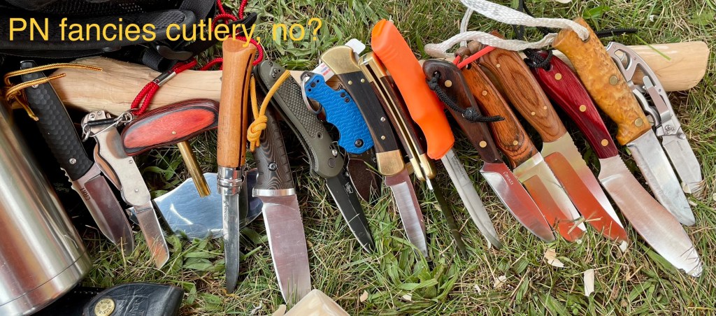 …while TS slings dog biscuits. Do I get bitten by my flock? Indeed. And… and I try to learn from the error. I also used to spend too much on fancy (Japanese-water… and Arkansas) sharpening stones, until I read this bush-crafter’s seminal work (and it’s well written, too). Book covers, carpet tape, and fine grit sandpaper. Assemble! It’s a cheaper media and it forced me to improve my hand-angle-positioning.
