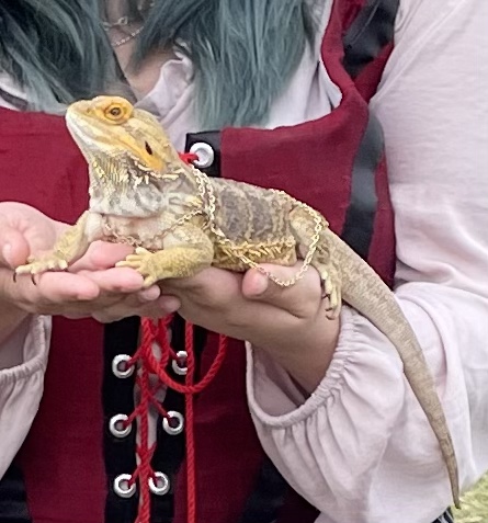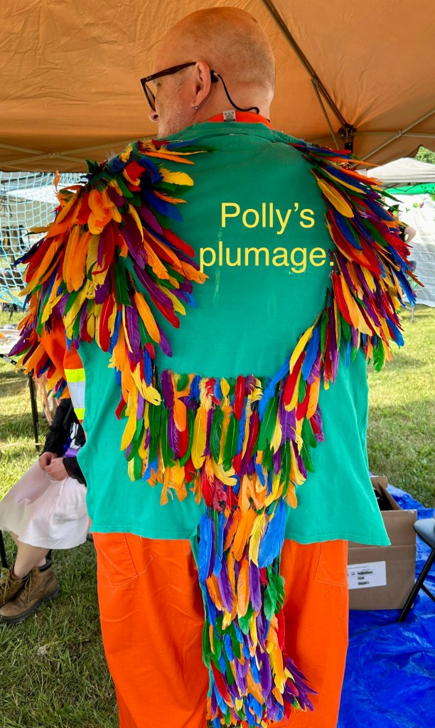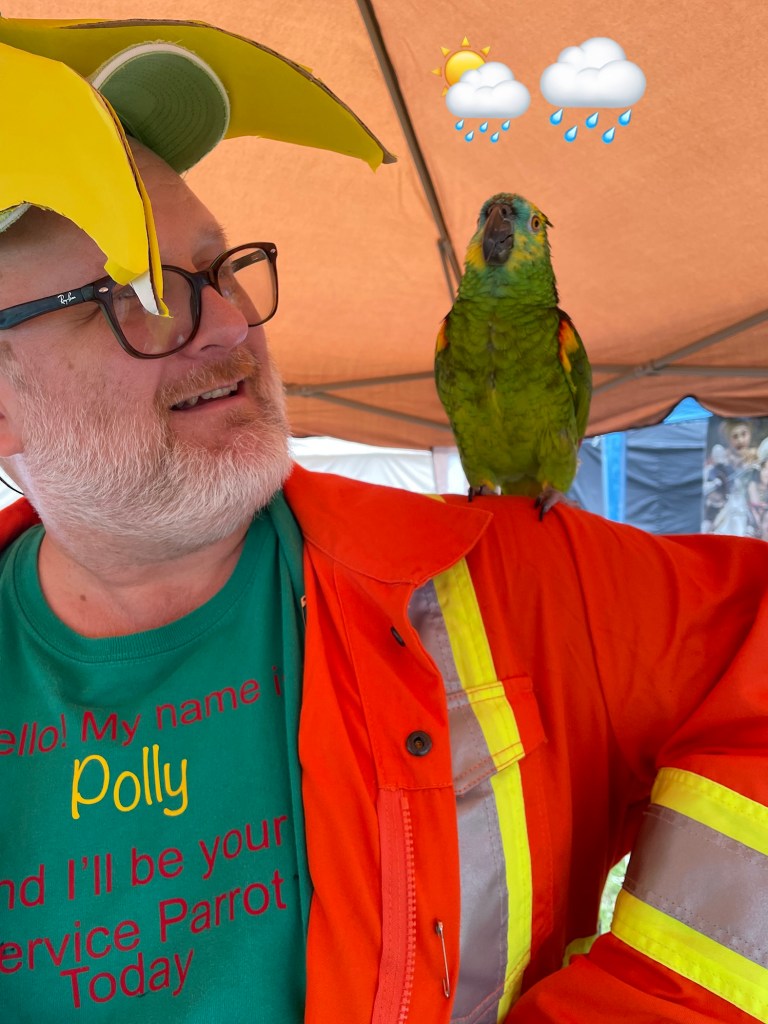 A 2-month-old raptor, with his baby fluff. Fine to look at. But don’t touch! And the baker of BDB, marvelling at her stock reduction. Nice!