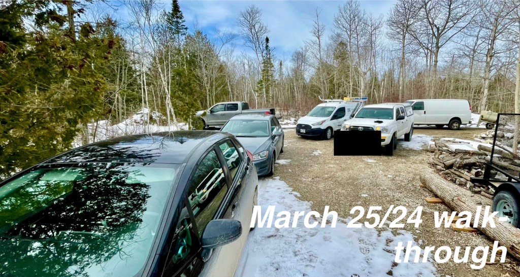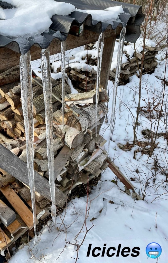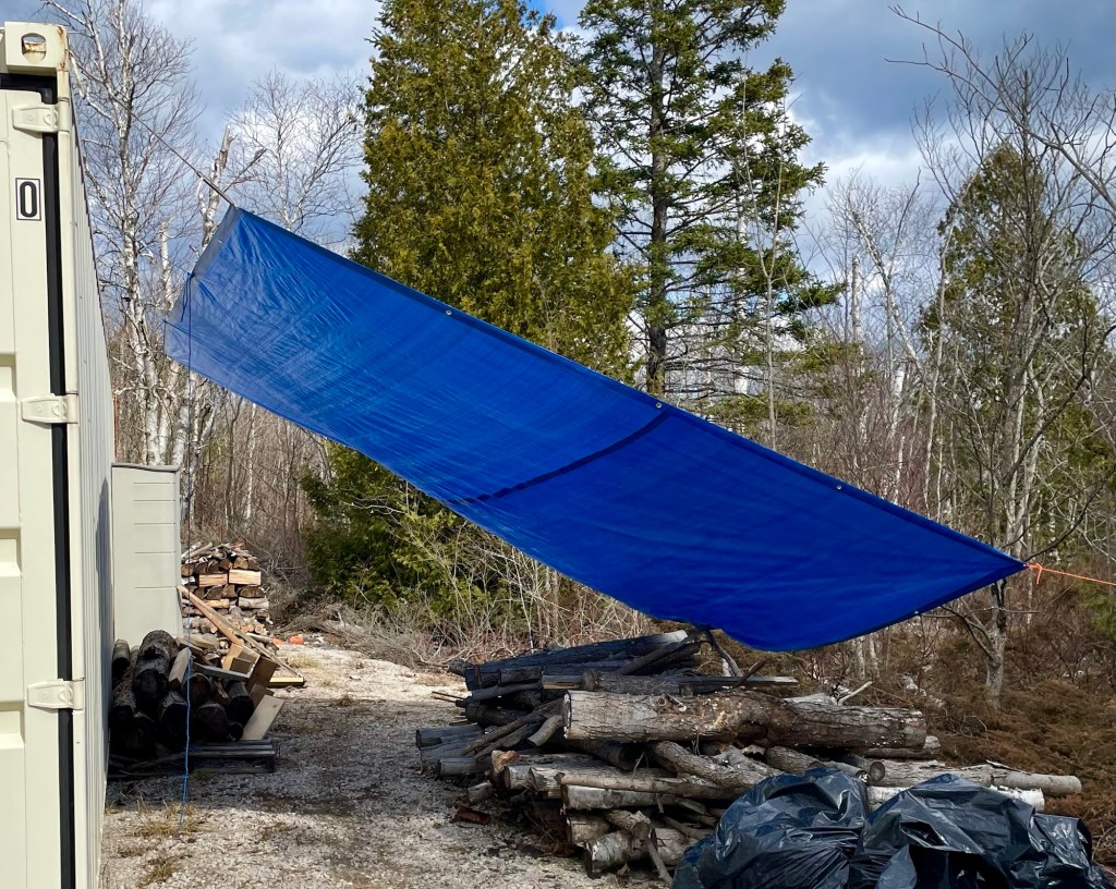 …and I did. The log pile under the blue tarp broke my fall. And my right heel took about half the remaining downward force of my walrus physique. Oh good = I didn’t smack my head on a log end. And the shifting logs dissipated the kinetic energy. Oh shit = my heel experienced some trauma. Oh good = able to put weight on my foot. And right now I get relief from elevating my foot & apply ice. Oh hell = I have to be reminded… set up a step ladder properly & do NOT grasp a sail-like with one hand. Man can’t withstand wind power.