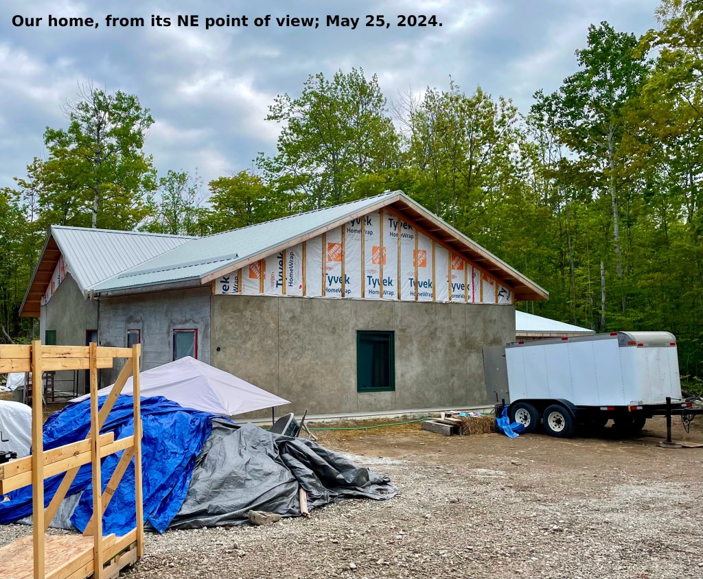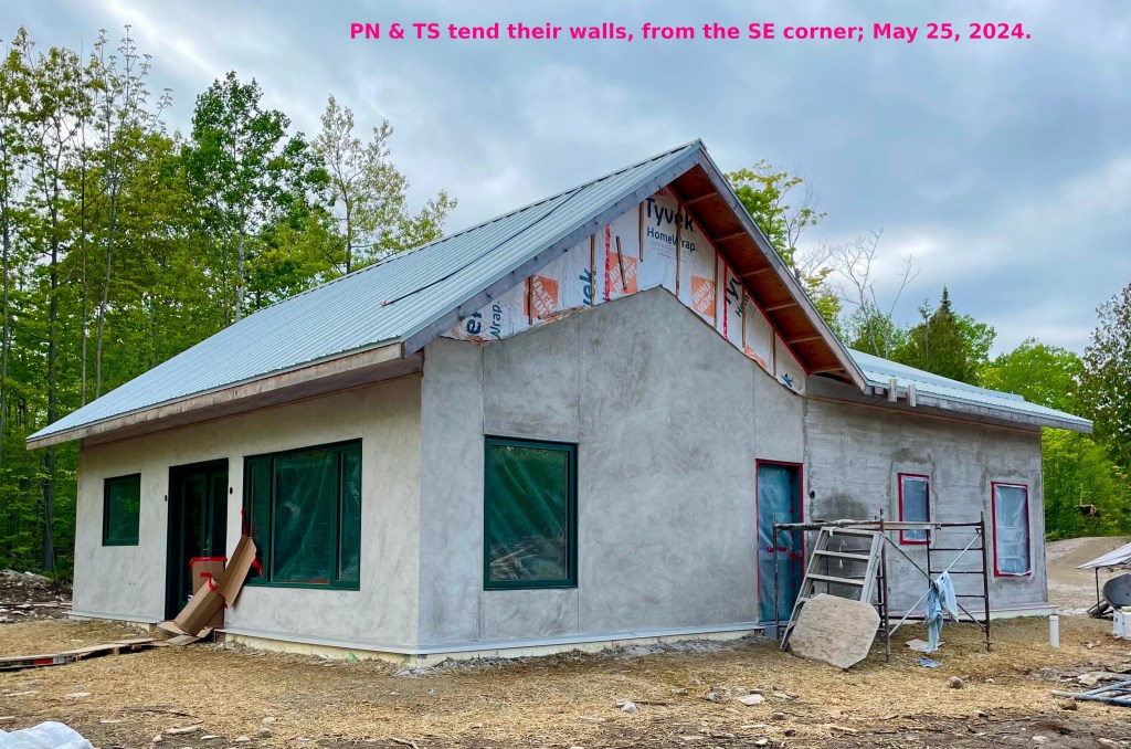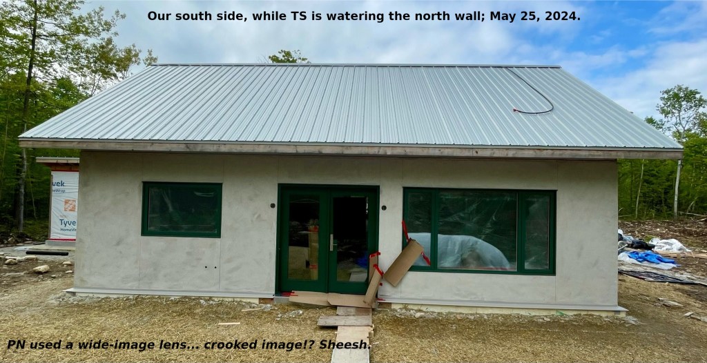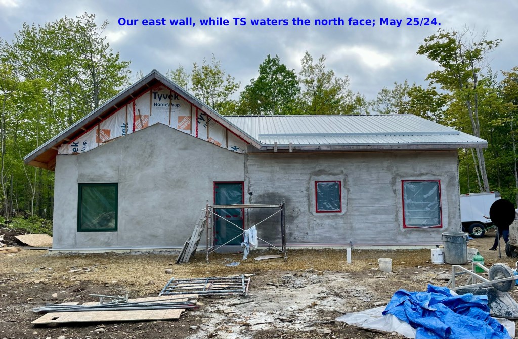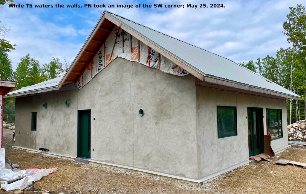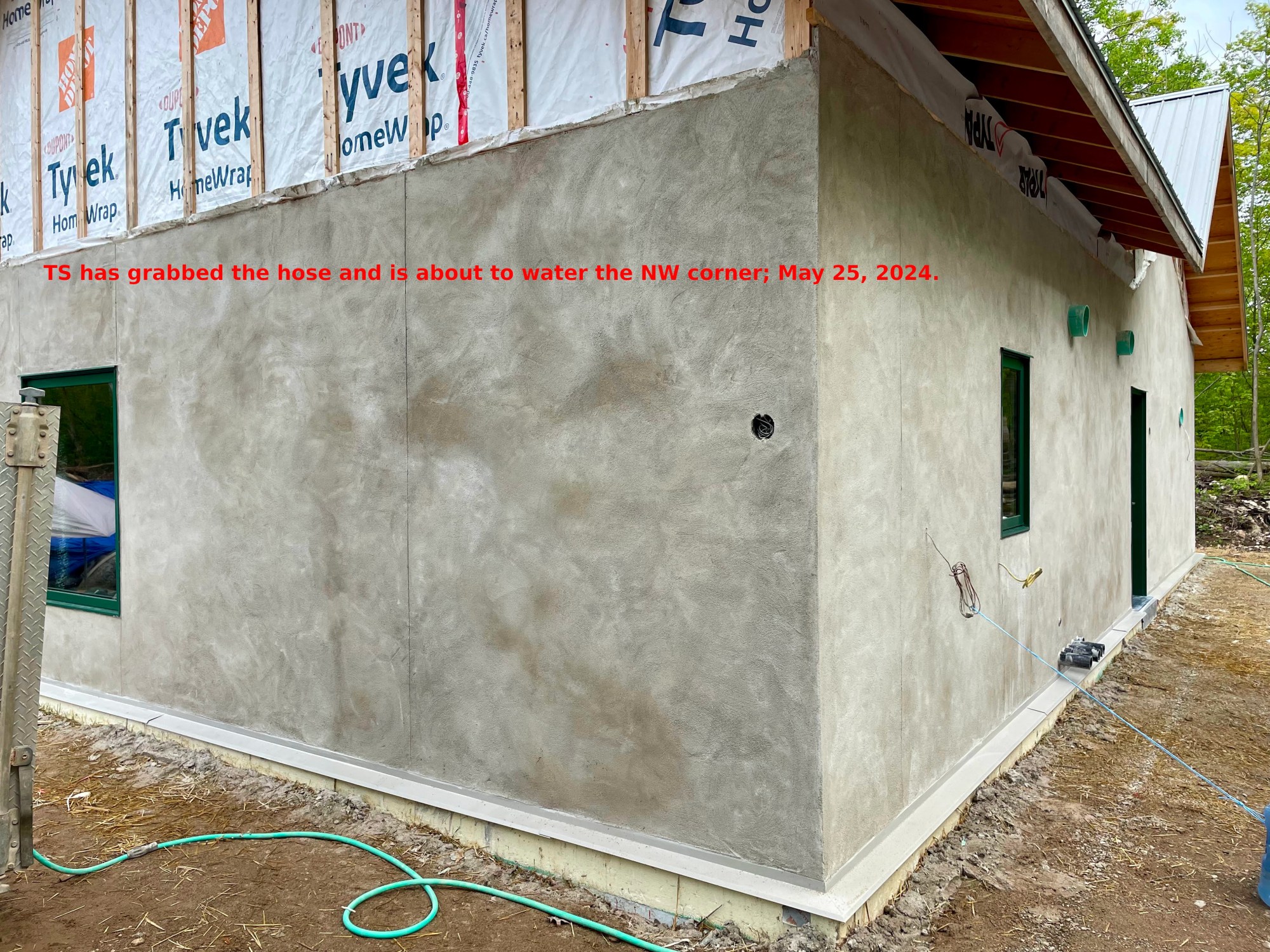 We are hydrating the walls to promote proper curing (and reduce the incidents of cracks). These walls have had 2 coatings so far… with another finishing coat (and a 4th colouring-sealing layer [using silicate paint]). Here is a link to a FAQ section about curing concrete. By the way, this is not your typical concrete used on sidewalks and the Ontario ETR-407. Nor is it stucco! I am still learning about its chemistry… Evolve Builders Group uses a DIFFERENT concoction, that somehow respects the group’s core ideas about sustainable building (or at the very least, less destructive building strategies).