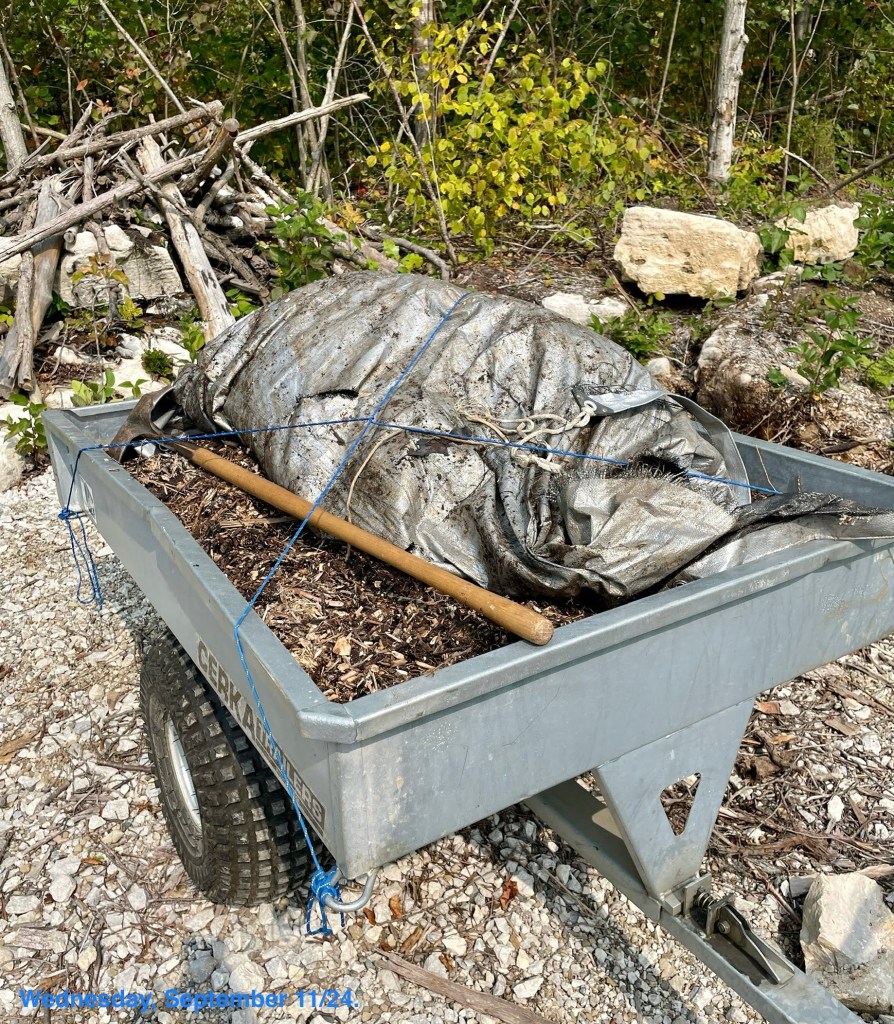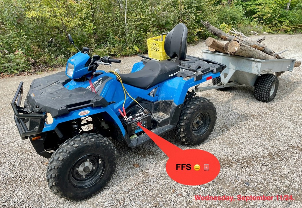 What awesomeness happened on the property today: TS and PN moved that pile of woodchips generated very early Spring, 2024 (I know that’s true because the wood chipper was stored in the seacan off-season). The hardwood chips were infused with mycelium and has a soil-like aroma and consistency. PN is glad he listened to TS and moved the media to where the hugelkultur operation will be set up. PN tossed the garbage tarp into the bin (reduce the amount of microplastics littering our construction site). PN can also confirm the awesome feeling of driving an ATV over the log-road. Yes, there is less soil compaction because the logs are displacing the machines’ mass. The tires are chewing up the logs and PN can pretend he’s a bad-anus. PN’s important life-lesson today: pay attention to the piggybacked deep-cycle battery’s polarity when attached to the ATV’s smaller battery. I only had a bright spark-arc. If I had done that with the batteries in our house, I would have welded the terminals to the jumper cables (and a hospital-visit inducing thermal burn).
