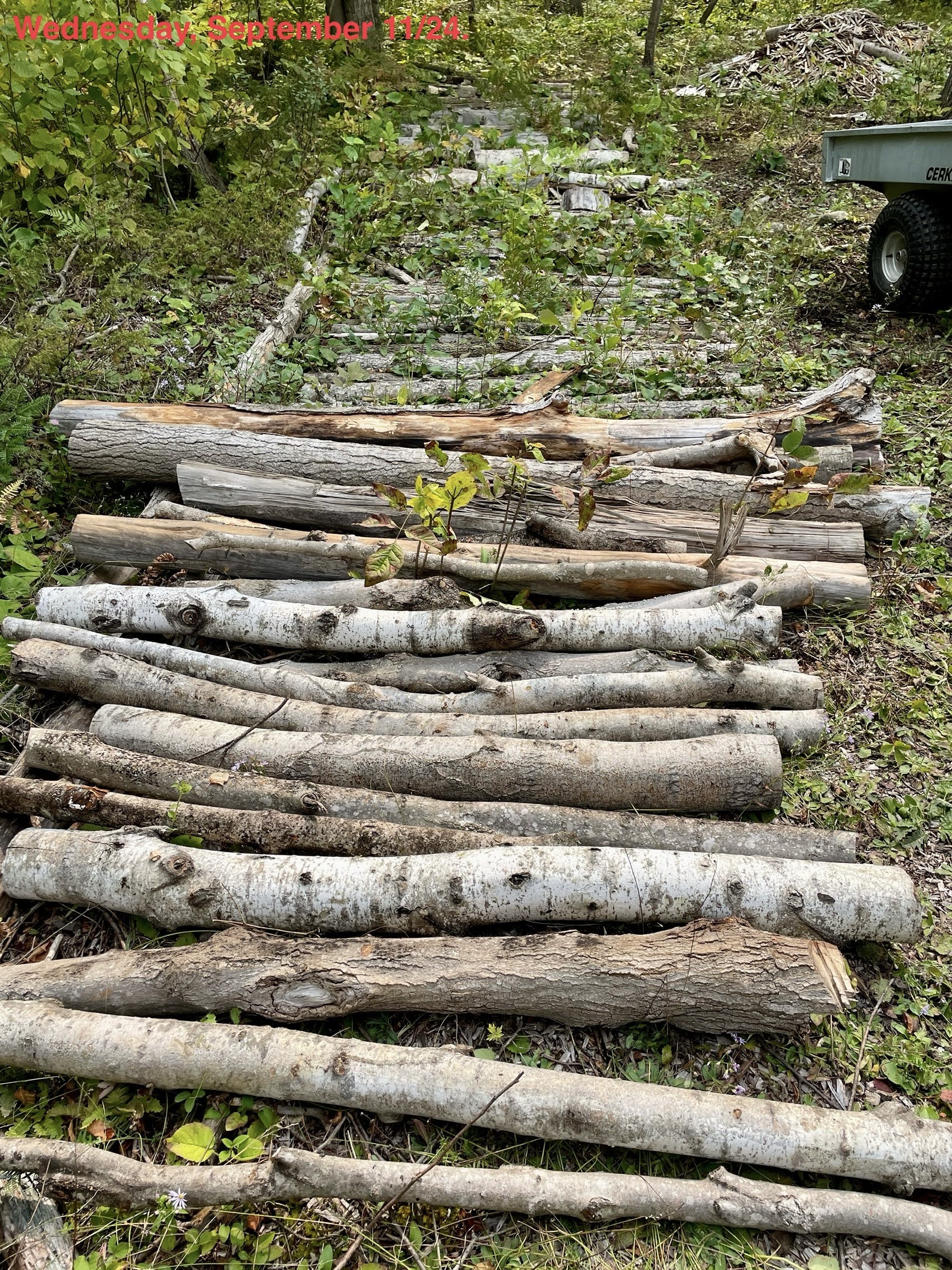 What awesomeness happened on the property today: TS and PN moved that pile of woodchips generated very early Spring, 2024 (I know that’s true because the wood chipper was stored in the seacan off-season). The hardwood chips were infused with mycelium and has a soil-like aroma and consistency. PN is glad he listened to TS and moved the media to where the hugelkultur operation will be set up. PN tossed the garbage tarp into the bin (reduce the amount of microplastics littering our construction site). PN can also confirm the awesome feeling of driving an ATV over the log-road. Yes, there is less soil compaction because the logs are displacing the machines’ mass. The tires are chewing up the logs and PN can pretend he’s a bad-anus. PN’s important life-lesson today: pay attention to the piggybacked deep-cycle battery’s polarity when attached to the ATV’s smaller battery. I only had a bright spark-arc. If I had done that with the batteries in our house, I would have welded the terminals to the jumper cables (and a hospital-visit inducing thermal burn).