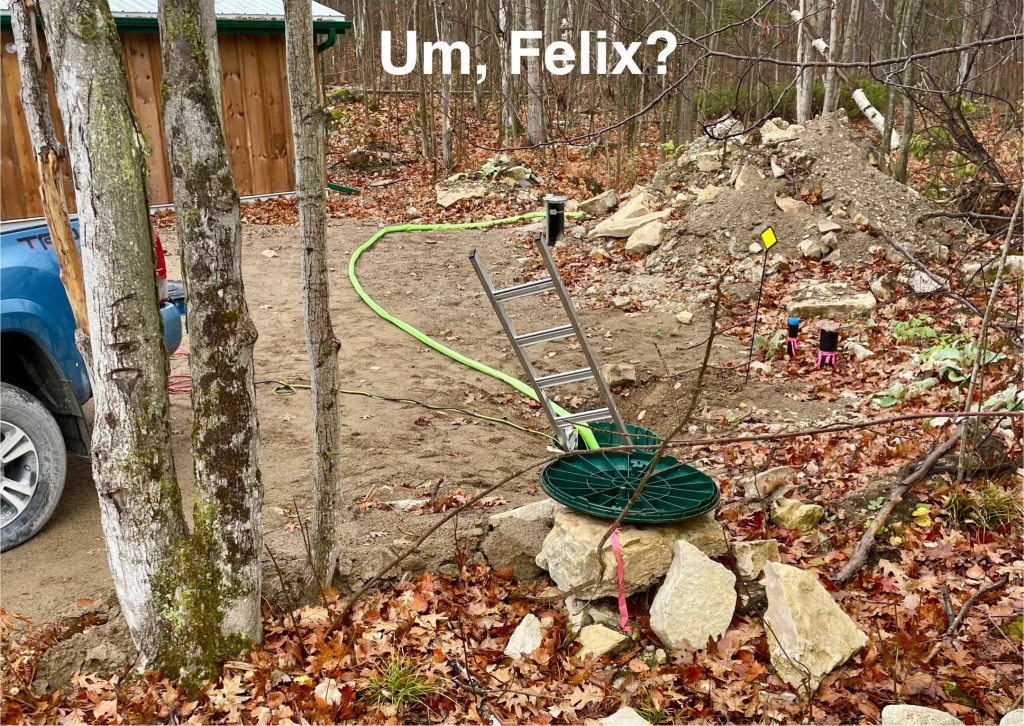 Cistern being washed out.A slow-recharging wellhead supplements this supply.Expect to see a wall of shelves.Expect to see a tiled backsplash.Mesmerizing kitchen work surfaces.PN put rocks all around it to reduce port damage.Our craftsman building our deck……and you haven’t seen nothing yet!!Click on the image to expand the image, view details, and muse about the meta-captions.