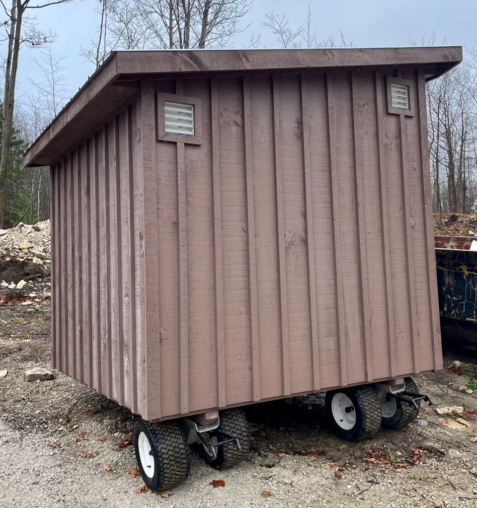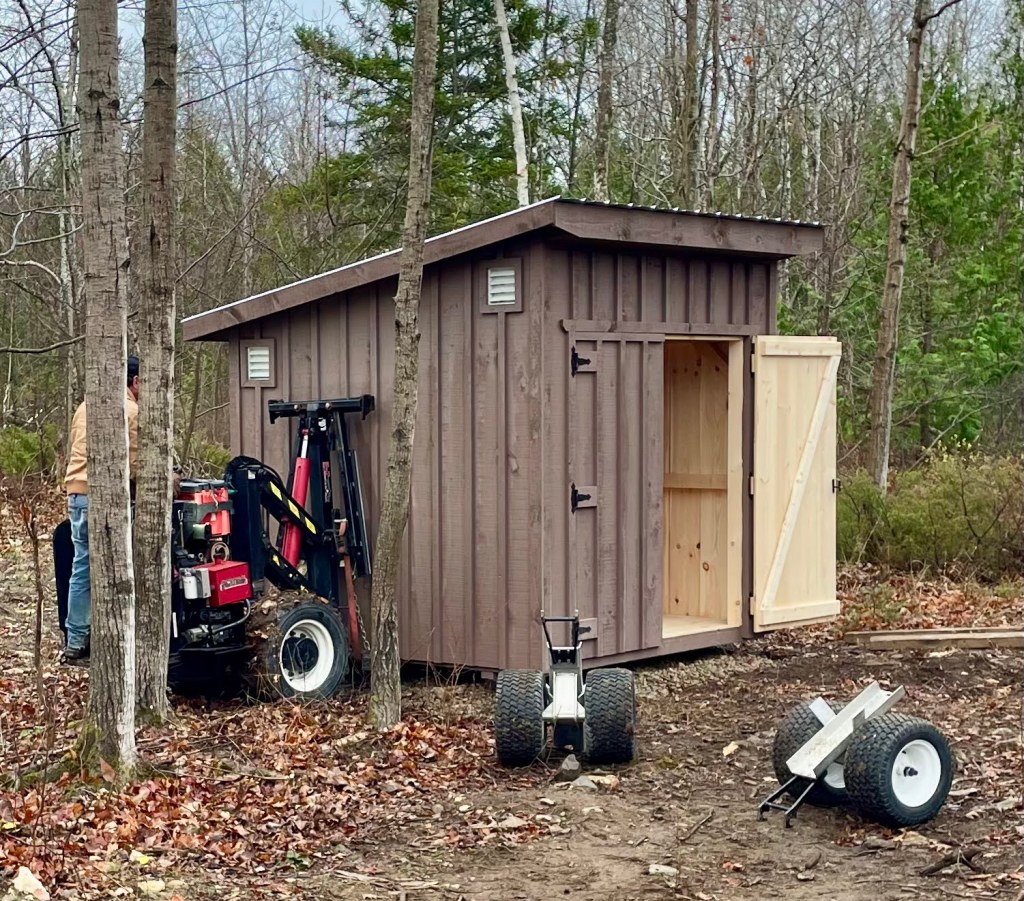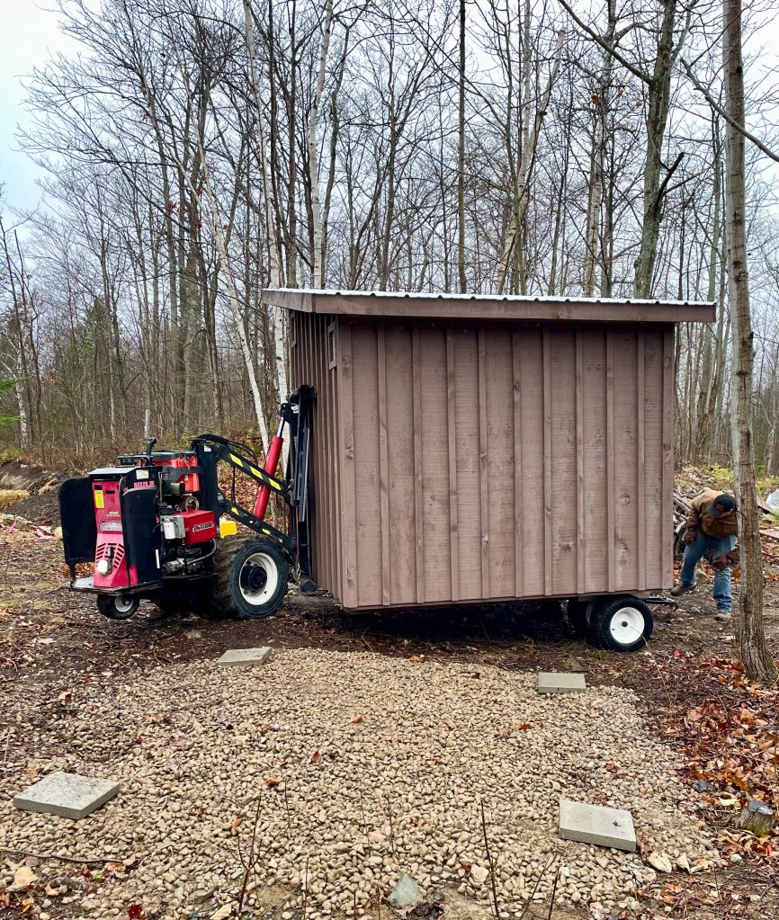 Our shed crawling up the driveway. First impressions!A motorized pallet jack, ON STEROIDS.Those wheels displace the downward force!JS is maneuvering around tree stumps. Like a boss!I didn’t expect JS to level it! For only $600?!JS apologized for the sheen of dirt. … … Really?!Glamour photo of its placement. Ready for permaculture!We had no clue how the hell JS was going to get that shed delivered. From the main road, we heard all kinds of whirring noises. And then saw THAT thing trundle up the gravel driveway. Click on image for details & metacomments.
