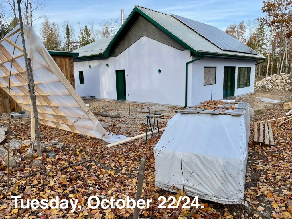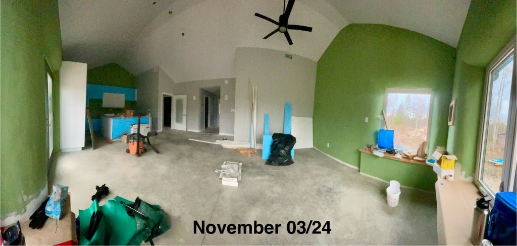 TUESDAY, NOVEMBER 05/24 — Example: yesterday afternoon, we received a text from our construction manager. They wanted us to pull out the dishwasher from the shipping container and move it into the house. Our plumber was on-site and could add this installation onto his workday. It was pouring rain outside. By 3 p.m., the light here on the Bruce Peninsula was failing fast (it can get twilight by 5-6 p.m.). PN & TS snarled at each other. PN didn’t want to drop everything and drive up to the farm in the rain and move shit around in an unlit sea-can. TS saw yet another time loss manifesting itself on our project. The painters, plumber, and tiler were working on top of each other. We finally agreed that such actions risk damaging the appliances. And how the ever-loving-hell were we going to do that activity without disturbing the interior painting (with drip-cloths on the floors). We had already taken the outer protective boxes apart to inspect the contents (last year, when we purchased replacement appliances for our condominium-under-renovation & hadn’t done that [bad decision]). No. Just no. Yes, we will have to now pay for a separate dishwasher installation (or risk a DIY job). PN and TS vetoed the manager’s instruction. And Evolve Builders Group acquiesced.