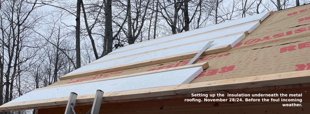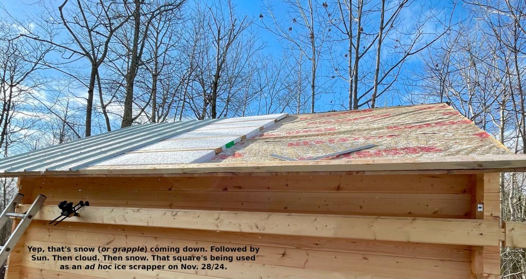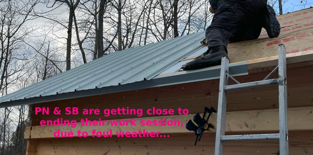 From a bunkie build point-of-view, we are making progress. Once that steel roof’s in place, I can begin drying that interior out with a propane-powered space heater. Then we can vacuum the exposed subfloor, apply Rockwool-type insulation, and add the floor panels. Bluntly, this bunkie kit has been a very costly build in T&M. It would have been much cheaper for us to have a unit built and delivered. Mind you, there would have been NO WAY to have the outbuilding located where it is. It’s tucked between the pre-existing e-shed and the main home.