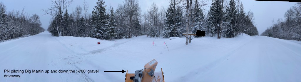 This is packing snow.I’m thankful for the peninsula effect.Still easier than using a wheelbarrow!We made tracks yesterday. Filled in!2 days of accumulation.Avenir Energy, where are youuuuuu?We’re lucky. Other locals had NO pickup.Big Martin = literary character = Cub Cadet snowblower.It’s about the process, no?TS will be leading this permaculture project.After recovering, I’m ready to do this… tomorrow?For the prepared, it’s a winter wonderland. Click on the images for detail and droll meta-captions.