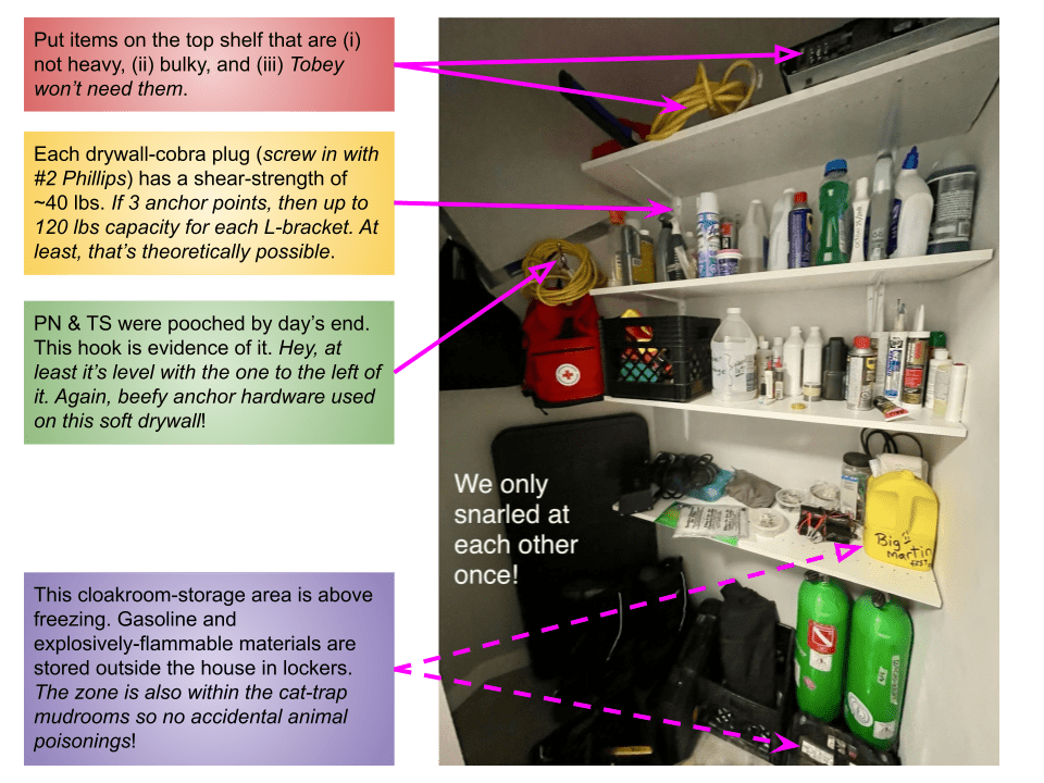 TS and PN were finally able to dig into the sea-can and grab some missing pieces for the IKEA billy bookshelves. Once we recover from Today’s homesteader-workout regime, we can assemble a few more and get items off the floor. We also got into the cloakroom at the east entrance and put up shelves. The drywall Evolve Builders used is softer in texture than what was used in our 1970-era condominium. We had to use a different drywall plug! It looks like an oversized and squat, nylon wine corkscrew — and were worth the premium price for them. Shoutout to Wilson Building Centre Inc. (Home Hardware) on Highway 6 north of Ferndale, Ontario.
