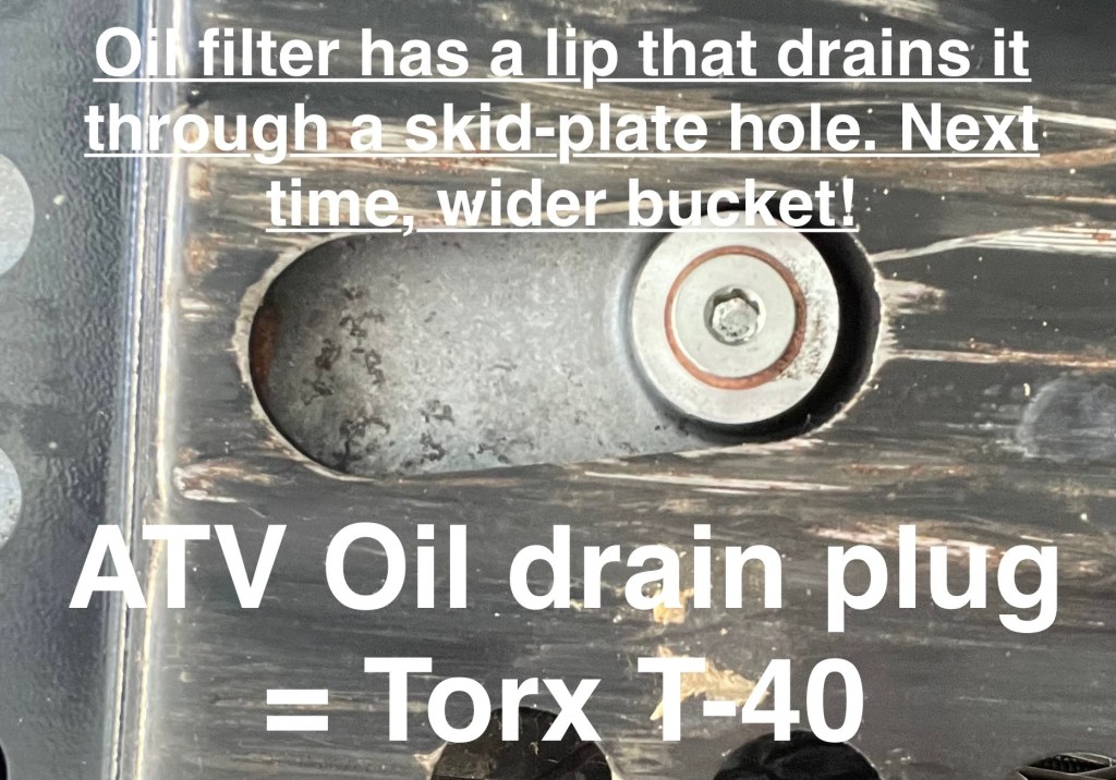 I smartened up and purchased extra oil, grease, pre-mixed engine coolant, and a replacement oil filter from my Owen Sound Canuck Tire (for significantly less money than the dealer). Grease guns are messy contraptions that can sweat oil from their pores. Oh, and grease nipples are fragile and can easily break off. I purchased a little nipple repair kit to replace the fragile brass fittings. I corrected the errors on the service manual (the drain plugs under the ATV are Torx, not Allen sockets; the manual assumes there’s no bumper nor winch accessories in place). And I’m taking a chance and reusing the copper sealing washer (I can buy cheaper sealers from Princess Auto, instead of gucci Polaris dealerships). Motorcycle maintenance is 1 thing — modern quad-bikes are a bugger to service. All the protective shrouds, bumpers, accessory-winches, heat-guards, and cargo bays have to be removed. This model has a combination of Imperial (SAE) and Metric (SI) screws/bolt/nut types. Why???