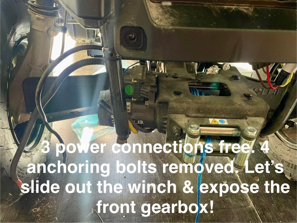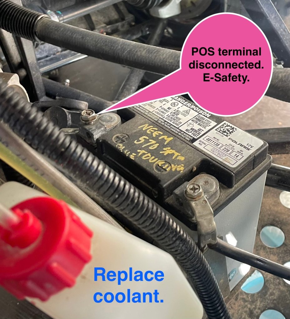 The rear or main transmission has yet another fluid type. I have both Polaris-branded transmission products sitting on a shelf in the cleaned up storage locker (seacan). I’ll need to ask around and figure out the differences between the 3 different gearbox fluids.