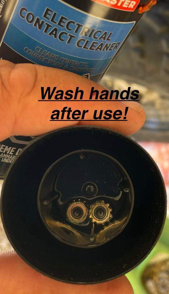 - Use automotive-grade corrosion cleaner, with the appropriate PPE (I won’t try using it bare-handed again [stupid Neem move]… use nitrile gloves). I’m going to dig up some dielectric grease and smear some onto the lead battery posts. I’m assuming its properties are similar to brake cleaner – an aggressive degreasing and deoxidizing agent.