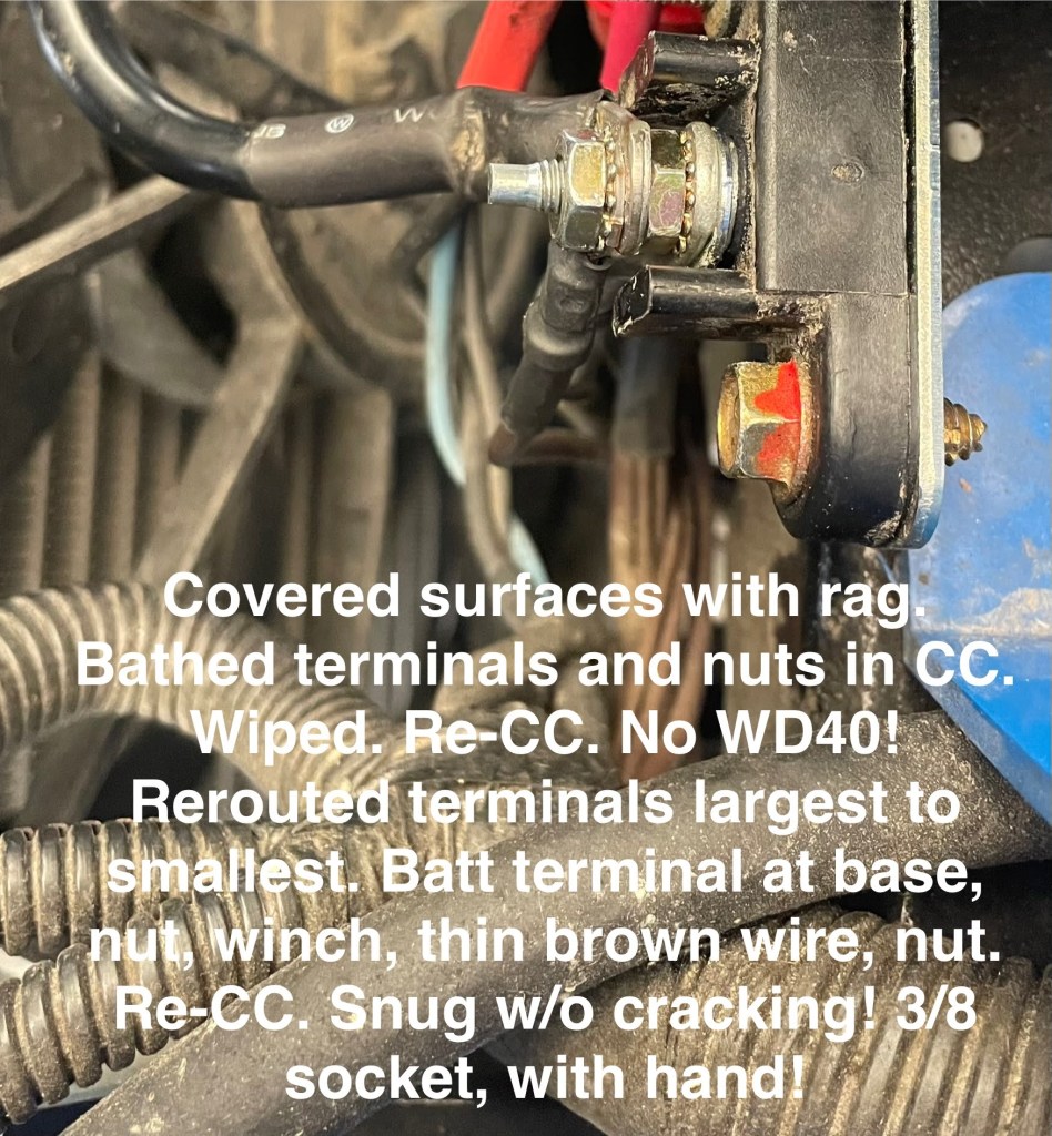 - Most failures are caused by sloppy maintenance and not keeping the surfaces clean. When I took the winch off to access the front differential, I neglected to clean the contacts. And the threaded posts were not snug. I let grime build-up on the battery posts, and sometimes left the retaining strap off. Bad. Bad. Don’t do that.