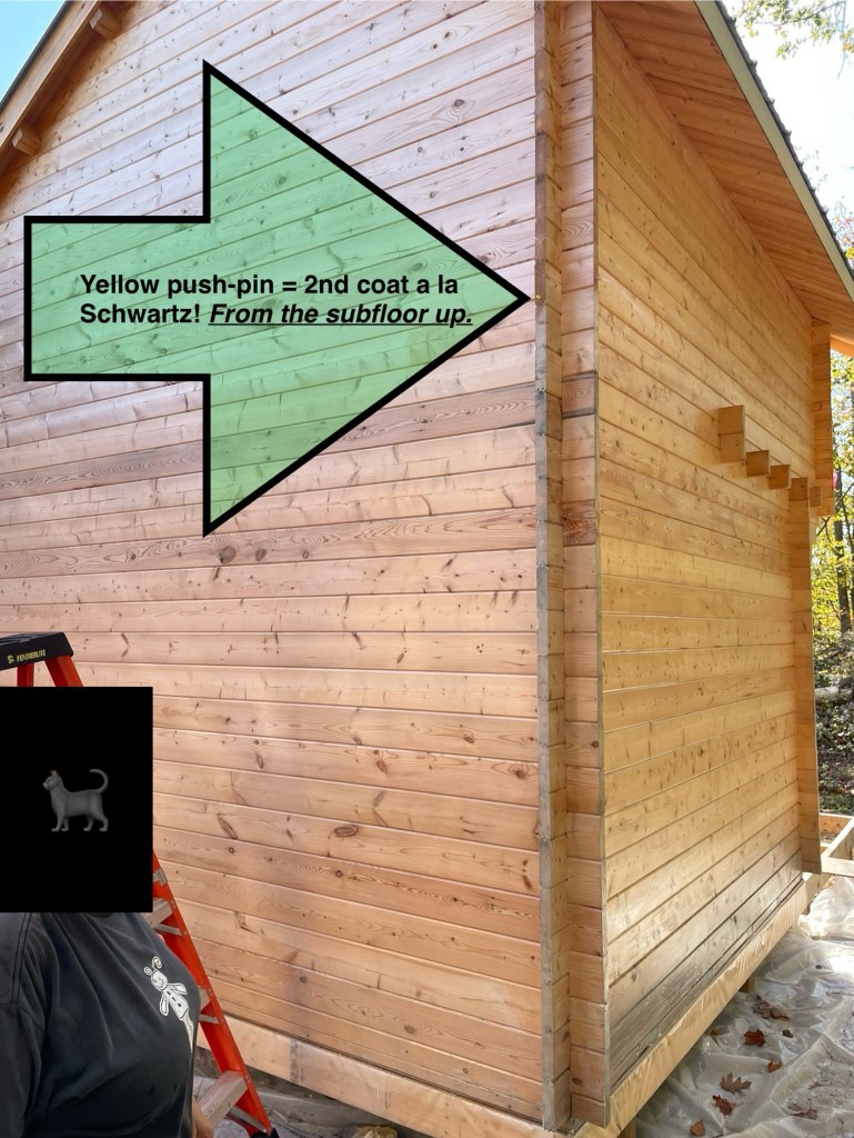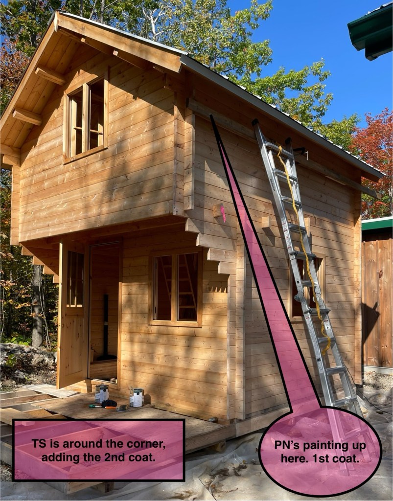 This paint-stain does add additional dampness to the bunkie’s walls. That’s a pain, as it exacerbates the flexing and warping we experience with this kit (warning = if you buy such a bunkie, assemble it A.S.A.F.P… don’t do what we did [no layaway plan unless you have assurances that the pallet is stored inside a heated warehouse]… and don’t dawdle with assembly as the kit is a hydrophilic sponge). Once we get a small pellet stove inside the bunkie (or other such auxiliary heating device), it can start drying out. That’s good. According to the documentation, the product will fully cure after 14 days. Right now is our ideal painting window — dry. Cool nights. >15C days. Windy. No driving rain nor snow (yet).