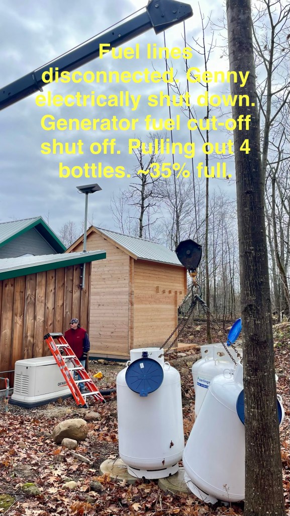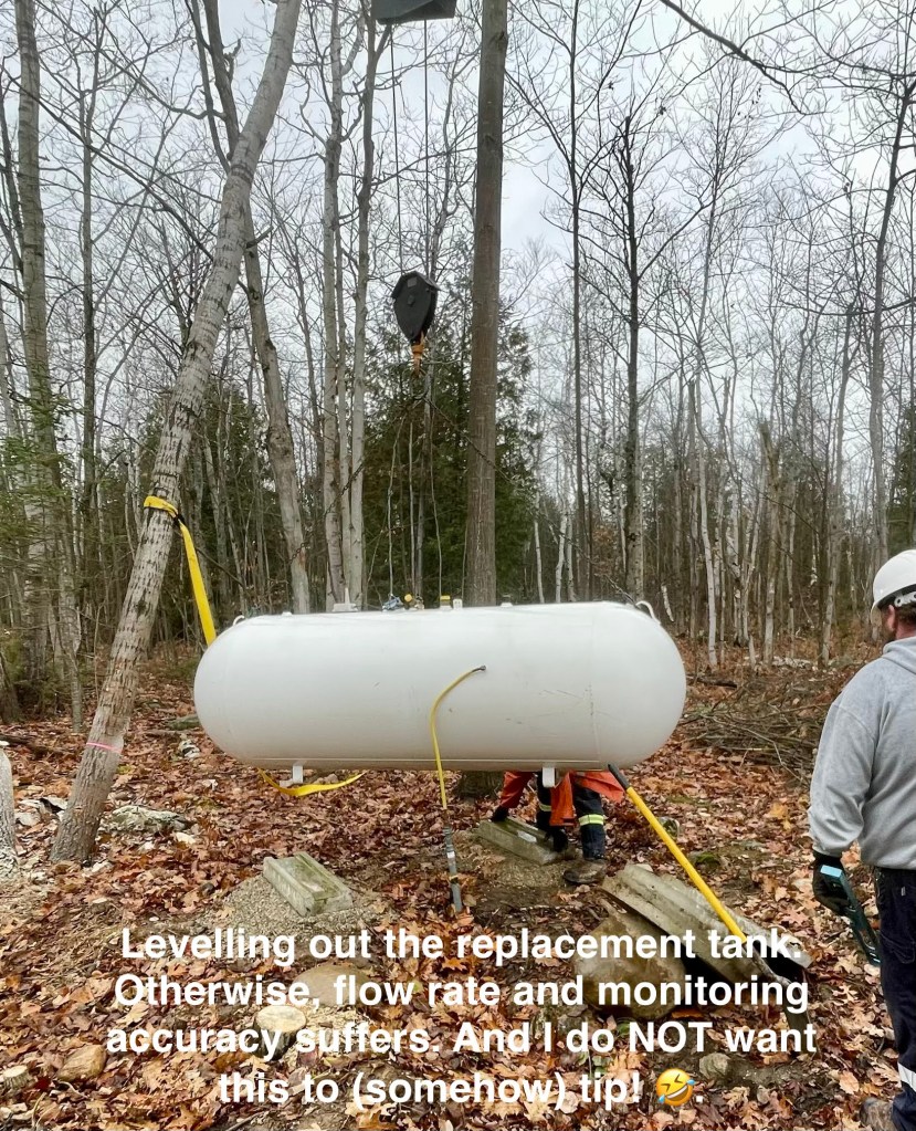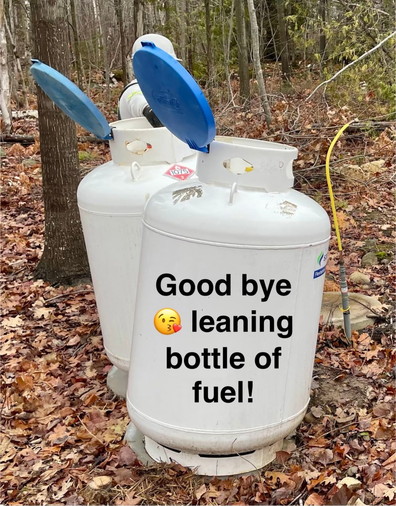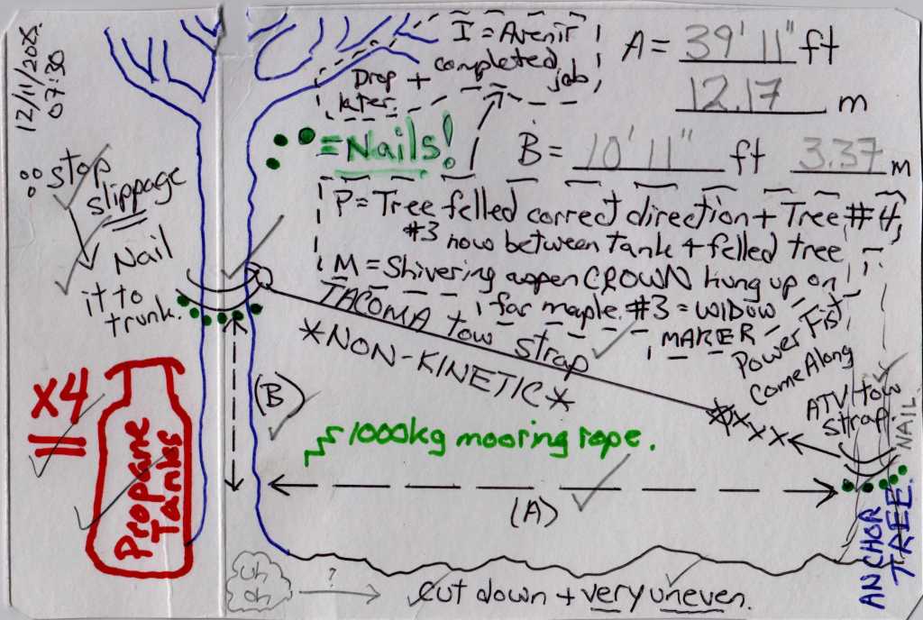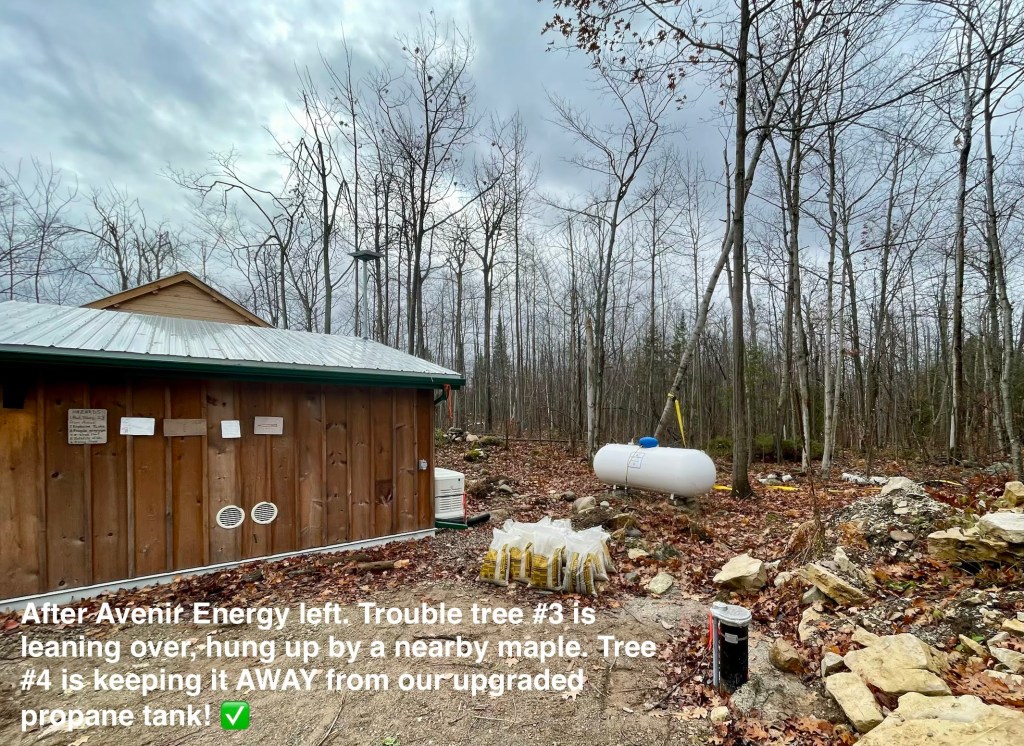 …clean out the microplastic filter on the washing machine; smoke some cannabis (thank you FO, on ON Highway 6); back-and-forth, 3h trips to Owen Sound; rig up a block and tackle to send worrisome tree #3 away from the explosive propane fuel bottles; attempt to drop that fucking tree #3 with 2 Avenir Propane installer dudes waiting to replace the storage tank;