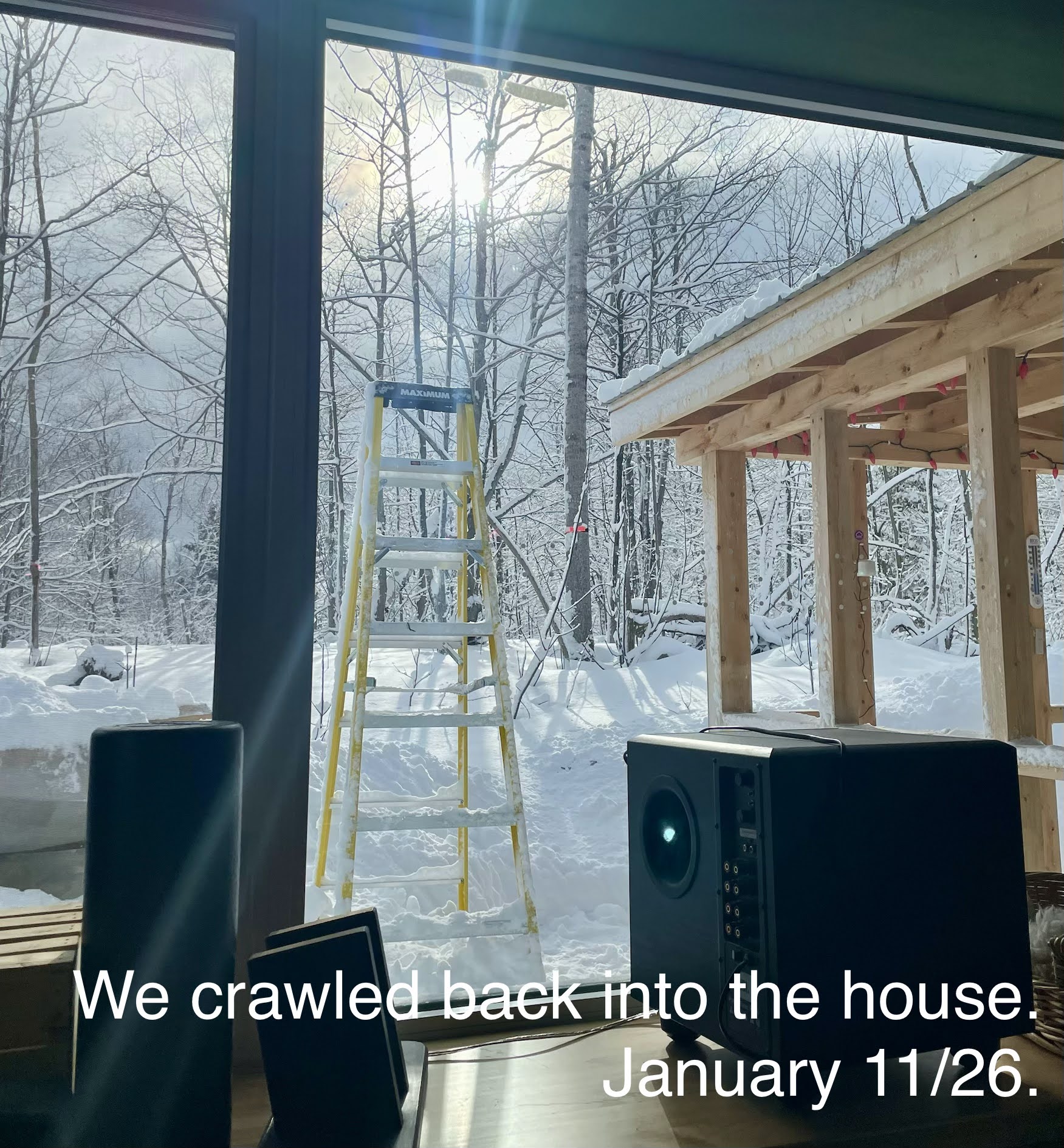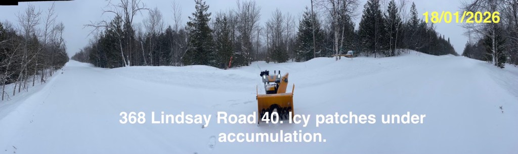 11/01/2026. OFF-GRID FACT. A sudden melt, followed by a snow squall makes for stressful ice-encrusted snow clearing. In less than 24 hours, we went from +12C weather, that was followed by rainstorms, a plunging thermometer, and we are now at -5C with icy blue skies.