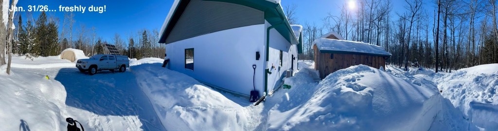…and digging. And digging. Life on the farm. Life off-grid = one has to carve out pathways from the door to the critical outbuildings’ access hatches. And that does not ever begin to address the metric fuckton of snow piled up on the metal roofs and glass electrical panels! Those pretty accumulations on top of the rain gutters? Yeah, those turn into ice dams and can rip the fuckers right off during the next snow melt.