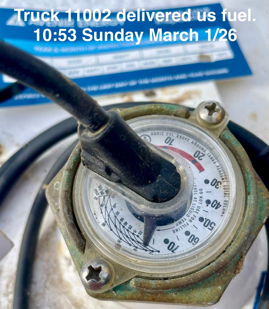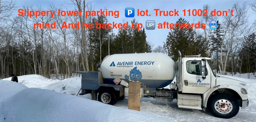 Click on the above image to expand the panorama. The trucks are only RWD… not double-axled. TS suspects the only way the truck got out of the mess was its sheer weight bearing down the the surface. Those are NOT winter tires on the vehicle, eh. I know I wouldn’t have risked the drive down. Meh… he did it. And this fill up might get us to the End of the heating season.