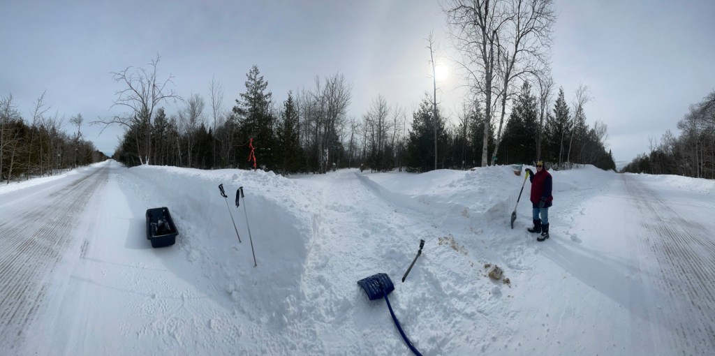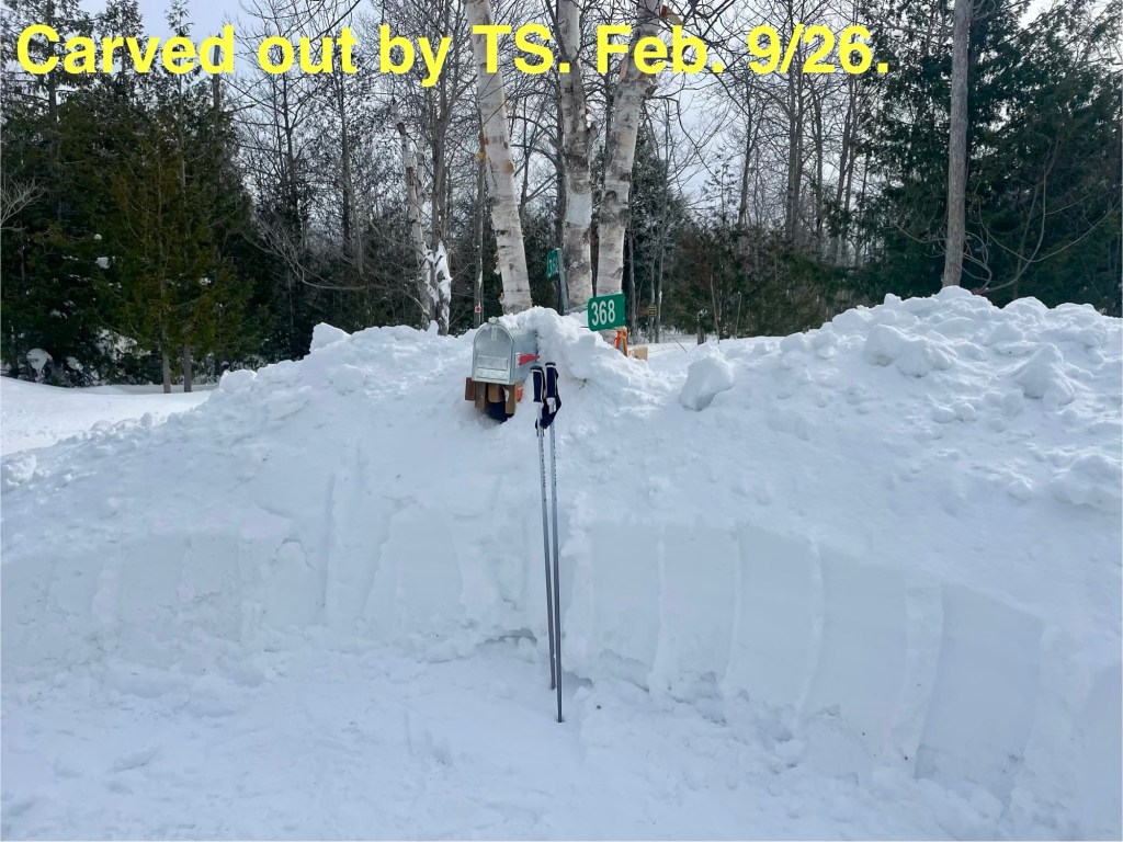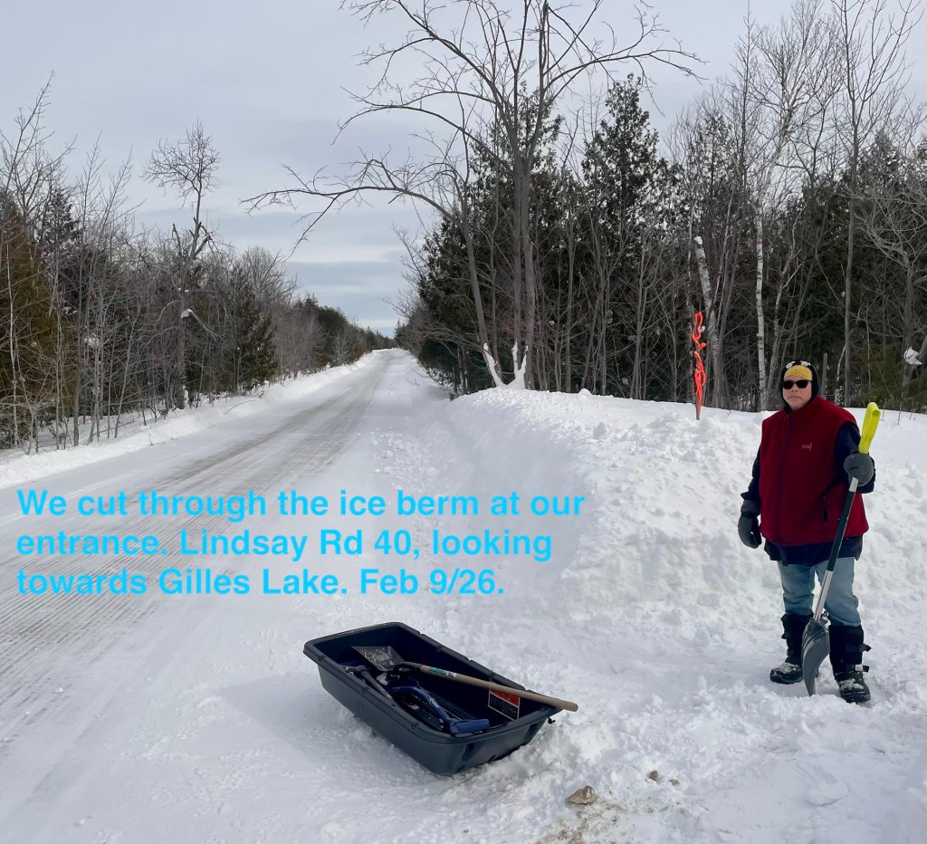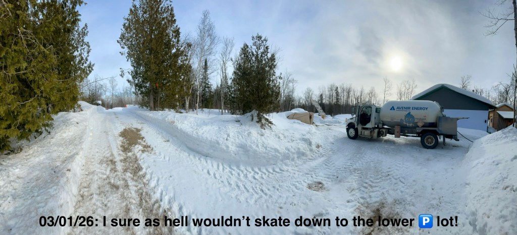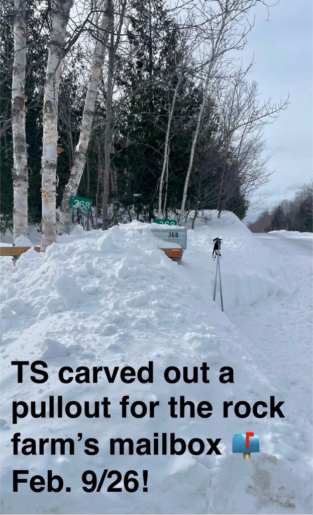 02/072026. THE MUNICIPAL ROAD TO HELL IS PAVED… Yay 😀, our Lindsay ROAD 40 has been scraped clean. And its tailings were tossed to the sides. Good = mailbox intact as it’s got a stout boulder under it. Bad = tomorrow, TS&PN will use metal shovels and pickaxes to chisel out the pullout so that couriers can leave mail for us. Ugly = there’s now a solid ice berm one must gun the truck over to get into the driveway.