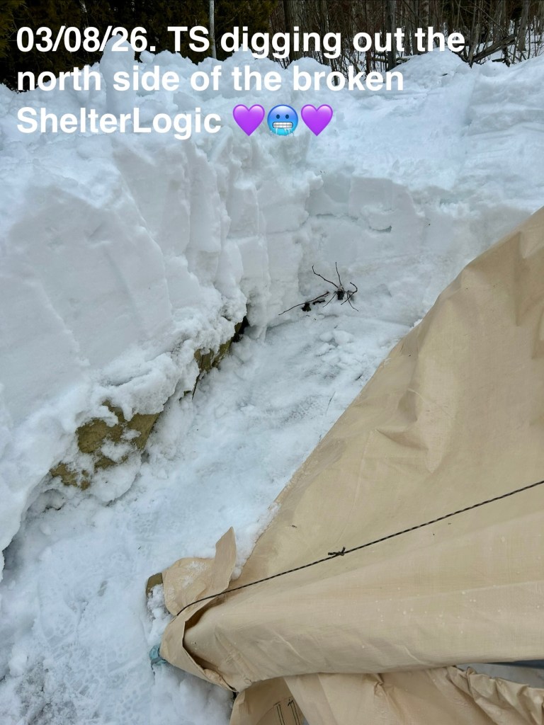 03/08/2026. TEMPORARY STRUCTURES HAVE LITTLE SNOW LOAD. Shelterlogic brand hoop houses can’t tolerate winter snow accumulations. It’s a good thing I insisted on putting an extra tarp on the skin, to reduce jutting ice damage or UV degradation. What did PN learn this season: for fuck’s sakes, don’t blow snow on top of the structure. I hastened the structure’s demise.