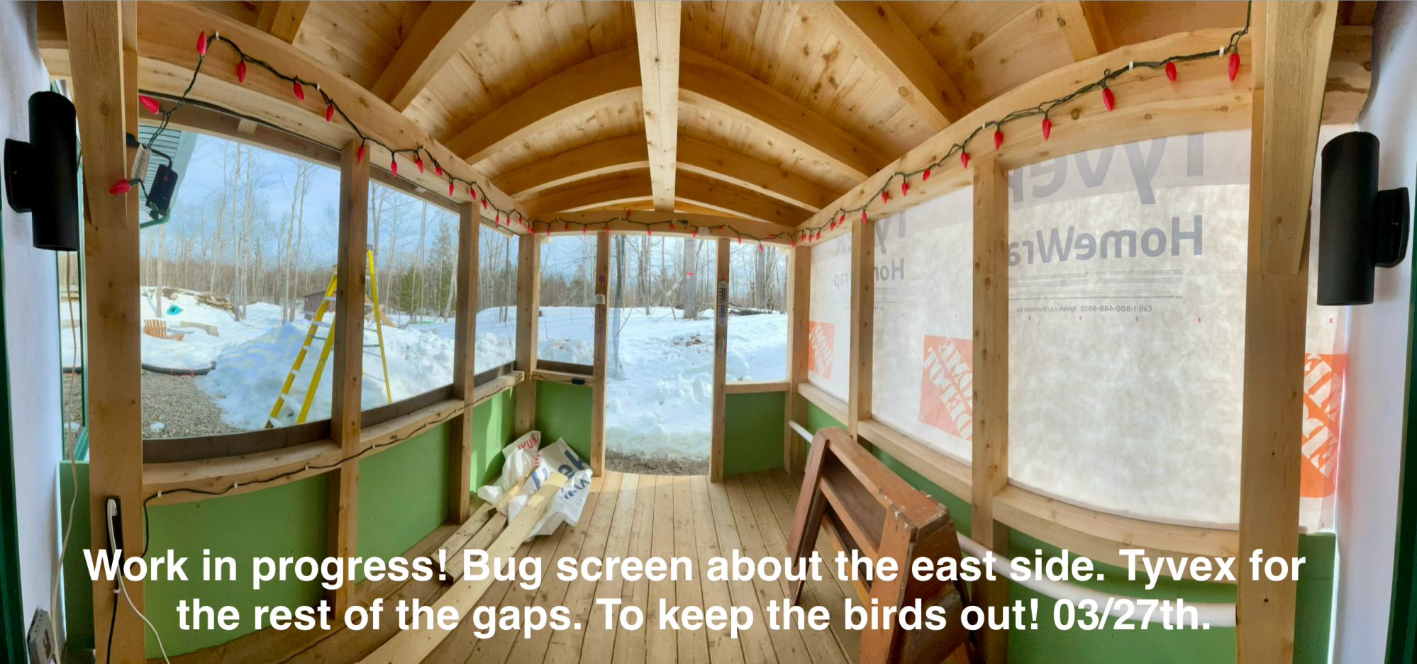 - And add additional Tyvek to cover the cedar soffits around the edges. Tyvek will also be used to patch over the south-facing door.