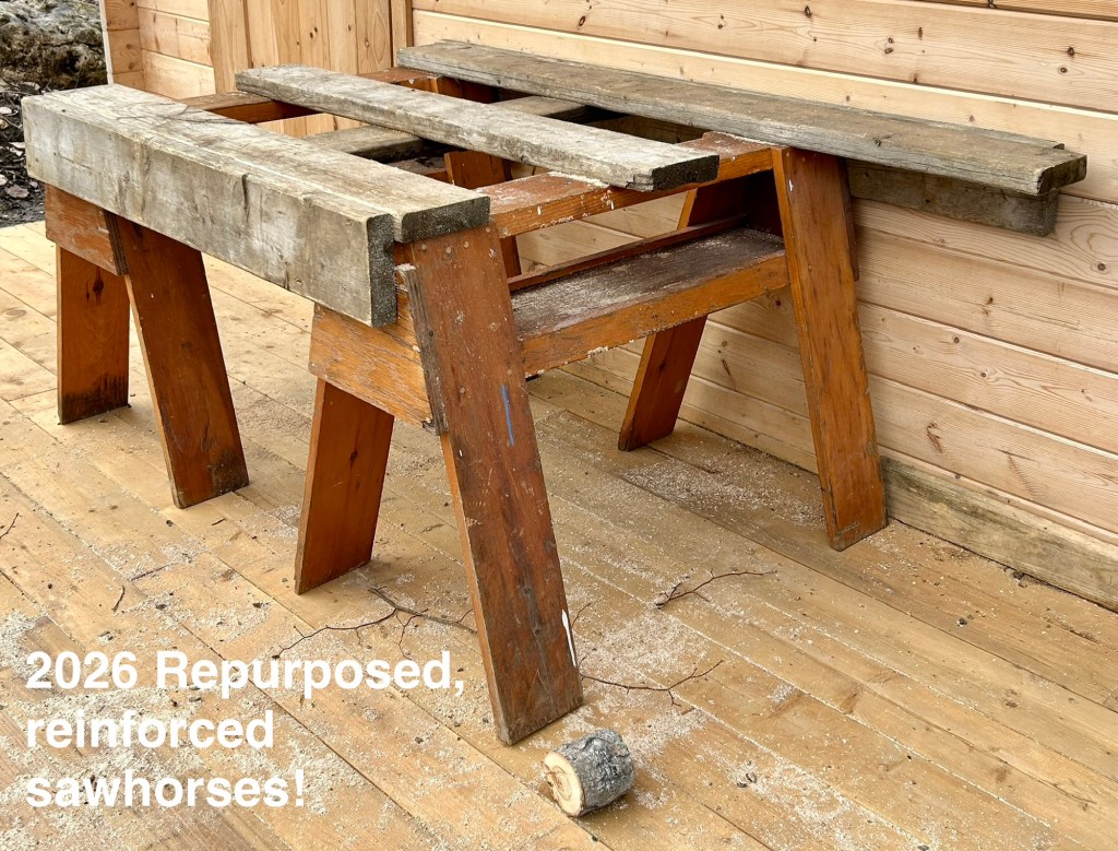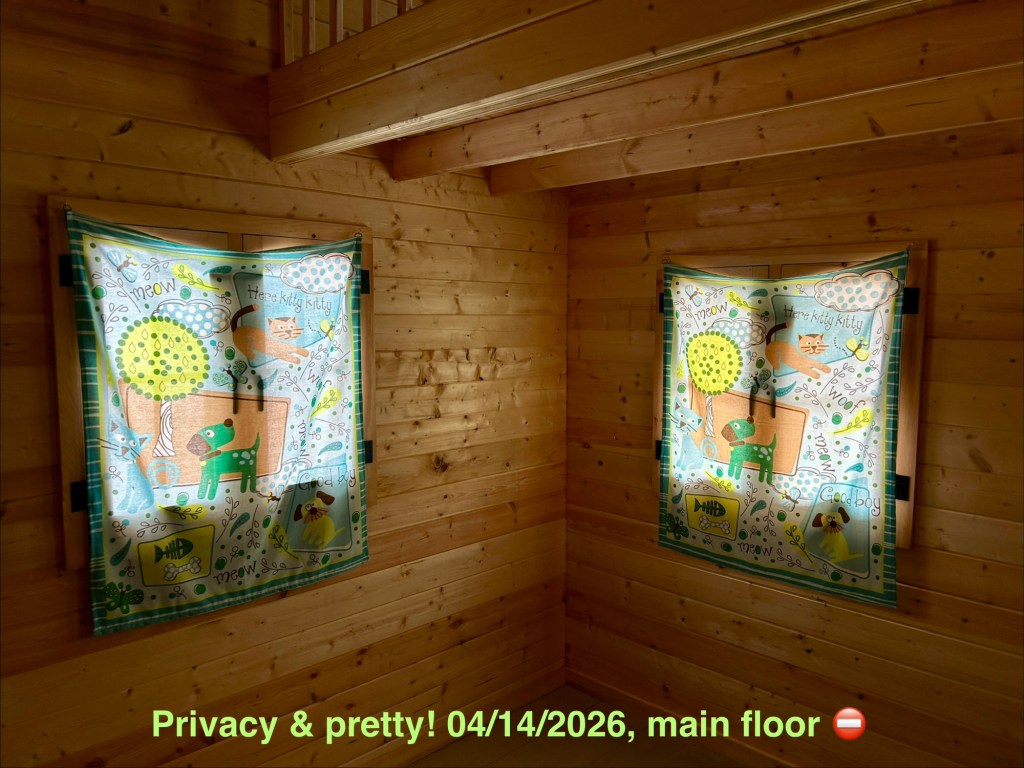 The DAY USE ONLY STUDIO now has privacy curtains. Scarborough sawhorses beefed up for their 2nd life outside the GTA, eh. Our home is so dark at night a single stove LED bathes the entire grand hall in a blue glow (regular night lights are restricted to the mechanical room and mudrooms [cat traps]).
